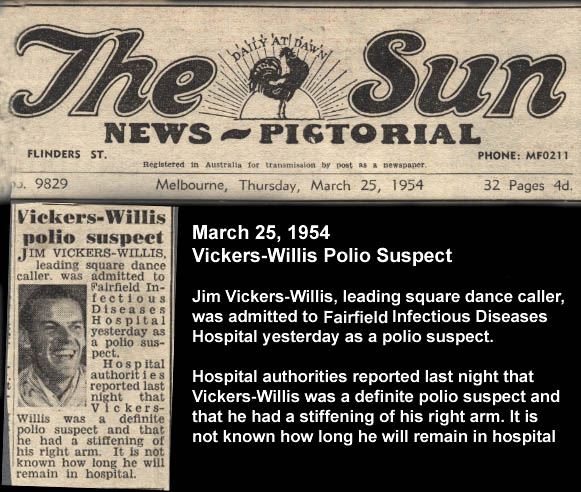 Riding a wave of immense public popularity as Australia's premier square dance entertainer, Jim Vickers-Willis made the front page of Melbourne's "The Sun" newspaper when it was announced he was hospitalised with suspected polio (see left). 'The Argus' newspaper (right) also featured Jim, pictured laying in his Fairfield Infectious Diseases Hospital bed, as he is introduced to his new son by his wife Beth. Being a journalist, Jim captured the dramatic moment in his life when he was placed into an iron lung, writing the following article published in both The Argus and The Sun newspapers - just eight weeks after contracting polio: Iron Lung Was Life To Me (May, 1954) "I am lying on my back in a 6-foot box. Every five seconds this box draws a breath for me, then expels it. It has saved my life. Living inside the sealed confines is no discomfort, because outside it I would not live at all. Every time I go outside it, I am gasping for breath and longing to get back inside, where it will push another easy breath of sweet air into my lungs. The box that keeps me alive when, so easily, I could die, is an iron lung. One day, eight weeks ago, I played nine sets of tennis. Now I am lying on my back, my arms and legs are useless, other organs in my body are only working at half speed and the iron lung is breathing for me. This is polio. With the idea of perhaps preventing someone else contracting polio, I want to tell you how I got it. The week before it began to work its way through my system I consulted my Doctor. He told me I was overworking and should take a weeks rest. I also saw a specialist, who said virtually the same thing. The specialist gave me a prescription for a tonic and some tablets to buck me up. I was too busy all the next week to have the prescription made up. I called a square dance for my private square dance club at Prahran Town Hall. When it was done I was very tired and felt pains in my back, around the region of my lungs. I went home, gave them a rub and went to bed….. I awoke with a bad pain in my back, and feeling very sick. I was booked to call at a square dance for my big private club in Adelaide on the Monday night and I immediately planned how this could be cancelled. In the morning, I asked my wife to call the doctor. He came to see me and said he thought I was suffering from nervous exhaustion. Then for a short period, I felt perfectly well. All trace of pain disappeared and I said to my wife: ‘I think I can go to Adelaide after all’. This is one of the features of polio that people should watch – this sudden temporary feeling of fitness that leads to the belief that all is well. The doctor agreed it would probably cause me more worry to cancel the Adelaide show than to fly over, so I decided to go. Immediately I boarded the TAA airliner, I knew I had made a mistake. My back began to ache unmercifully and so did my head. In Adelaide I attended an orchestra rehearsal, called the programme at the club and made a radio broadcast over 5AD…...I was at my last grasp at the end of the programme. The following morning I was in The Advertiser [Adelaide] office typing when I noticed that the little fingers of my right hand would not hit the keys properly. They appeared to be slightly paralysed. This was the first time I thought of polio. Later, I flew back to Melbourne……When I reached home, a young Doctor who had recently worked in a polio ward in Tasmania, looked at me for a few minutes, made me bend forwards and back, examined my arms and legs and said ‘I think you might have polio’.…I was taken to Fairfield Infectious Diseases Hospital as a precaution. From that time, I spent many hours when I did not think I would live – and many more when I particularly didn't’t want to. A wonderful nursing staff and doctors set out to encourage me right from the start, could do little to alleviate the shocking discomfort of those early days and nights of polio. The pain in my back was often relieved by the tablets the nurses gave me. But the discomfort could only be relieved by the personal attention of the nurse as she turned over a pillow, moved a half paralysed arm or leg or turned me from side to side every few moments of the day and night. I was so uncomfortable that all through the day and night, I was constantly ringing the bell for the ward nurse, shouting for her, and taking up an unfair proportion of her time. I kept on asking for a private nurse and this was granted. I then spent two comparatively peaceful nights with this devoted little nurse not only sitting near me, but actually watching my every movement for the entire day and night without a break…….. In the first three days, my right arm became immovable, then my right leg. My left arm became markedly weaker, and my left leg remained the strongest, although it too was severely affected. I had often wondered what it was like to have limbs paralysed. You look at your arm and you say to yourself: ‘I’m going to move that arm’. You try your darndest to move it but it just will not budge. One of the things that shocked me when I came to realise it, was the complete absence of polio treatment. There is no treatment. We all read that this is so, but I rather imagined when I first came to Fairfield that people would be giving me injections of penicillin or something. Of course, that is not so. It shocked me when I discovered they were going to give me absolutely no treatment at all. It was just a matter of lying in bed drinking orange juice and wait for the polio to cease attacking vital nerve centres, paralysing limbs, muscles and organs. About the third day, the doctor appeared to consider the polio was stopping its march through my body. I felt very bad and remember on the second day and third nights, gritting my teeth and saying to myself: ‘ Well, I’ll be fortunate if I see tomorrow’. I now realised that at this stage, I alone didn't’ have the strength to turn the corner unaided. I f